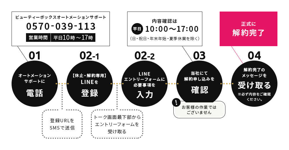 ②当社にて、解約申し込みを確認いたします。確認は弊社営業時間内(平日10時~17時、土日祝・年末年始・夏季休業を除く)となります。